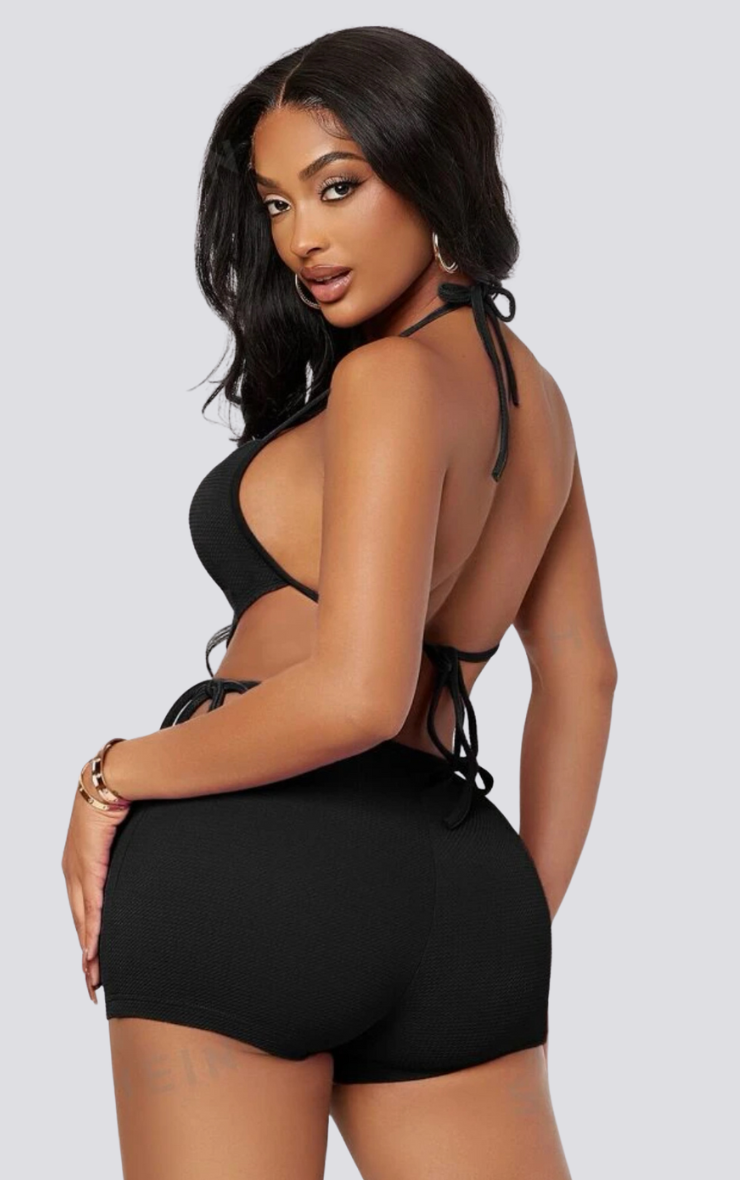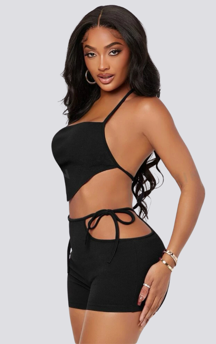 Backless halter top and cut out shorts. Thick material.