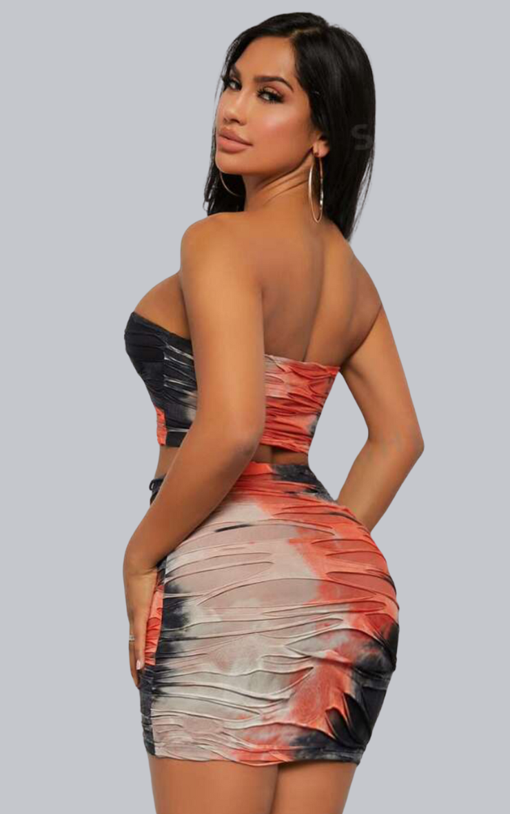 Red tie dye bandeau crop top and mini skirt set